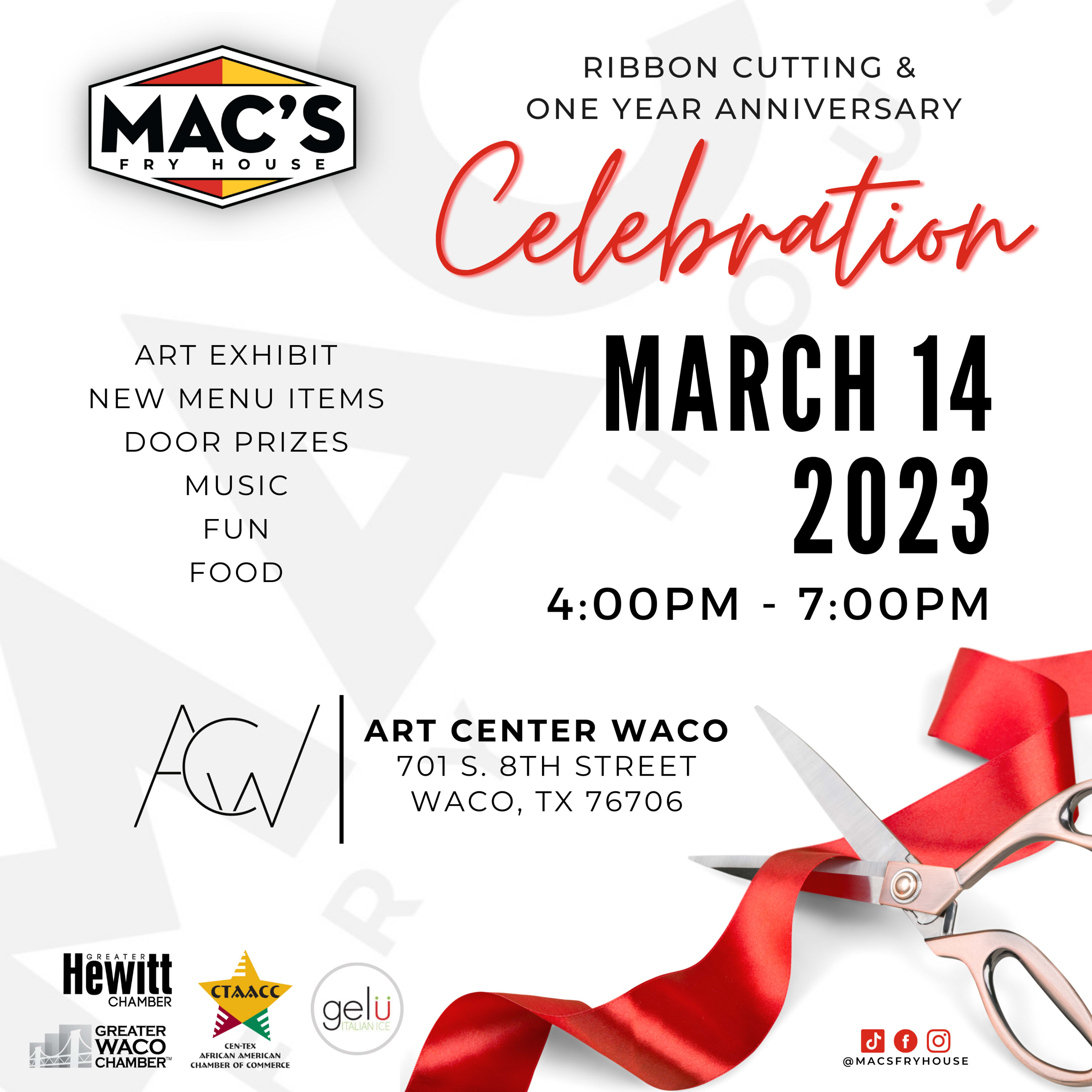 Please join us on Tuesday, March 14th at 4:00pm for a ribbon cutting to celebrate and welcome Mac's Fry House to our Greater Waco Chamber of Commerce!!! This ribbon cutting will be hosted at the beautiful Art Center Waco in downtown Waco and Chamber members are invited to attend and show their support. We hope to see you there!