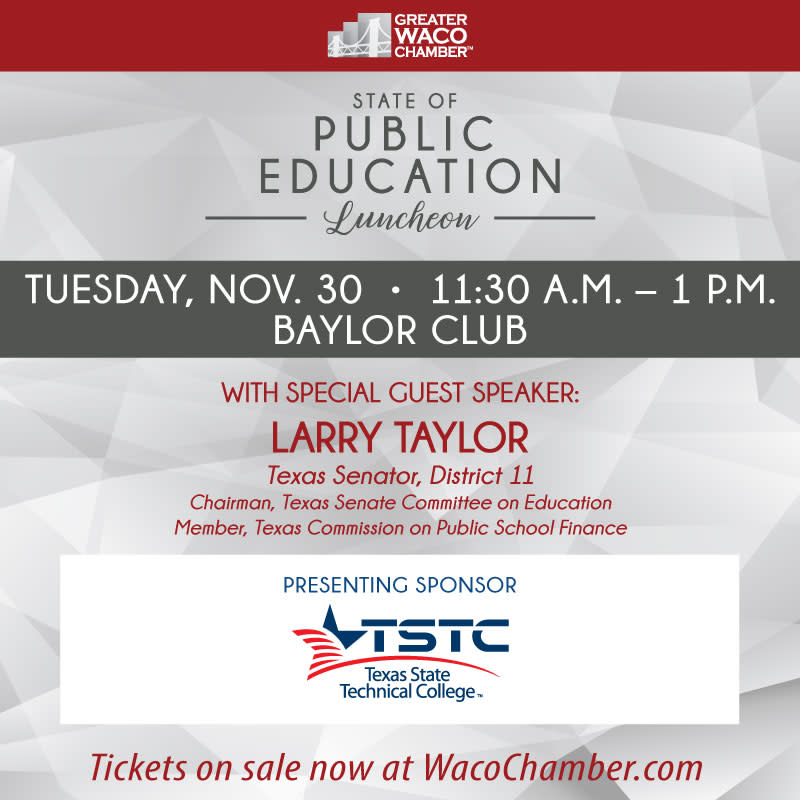 Please join us for our State of Public Education Luncheon on Tuesday, November 30th, at 11:30 a.m. at The Baylor Club. We will hear an update- and a look ahead- from Senator Larry Taylor. Register by November 19th for this not-to-miss annual event!