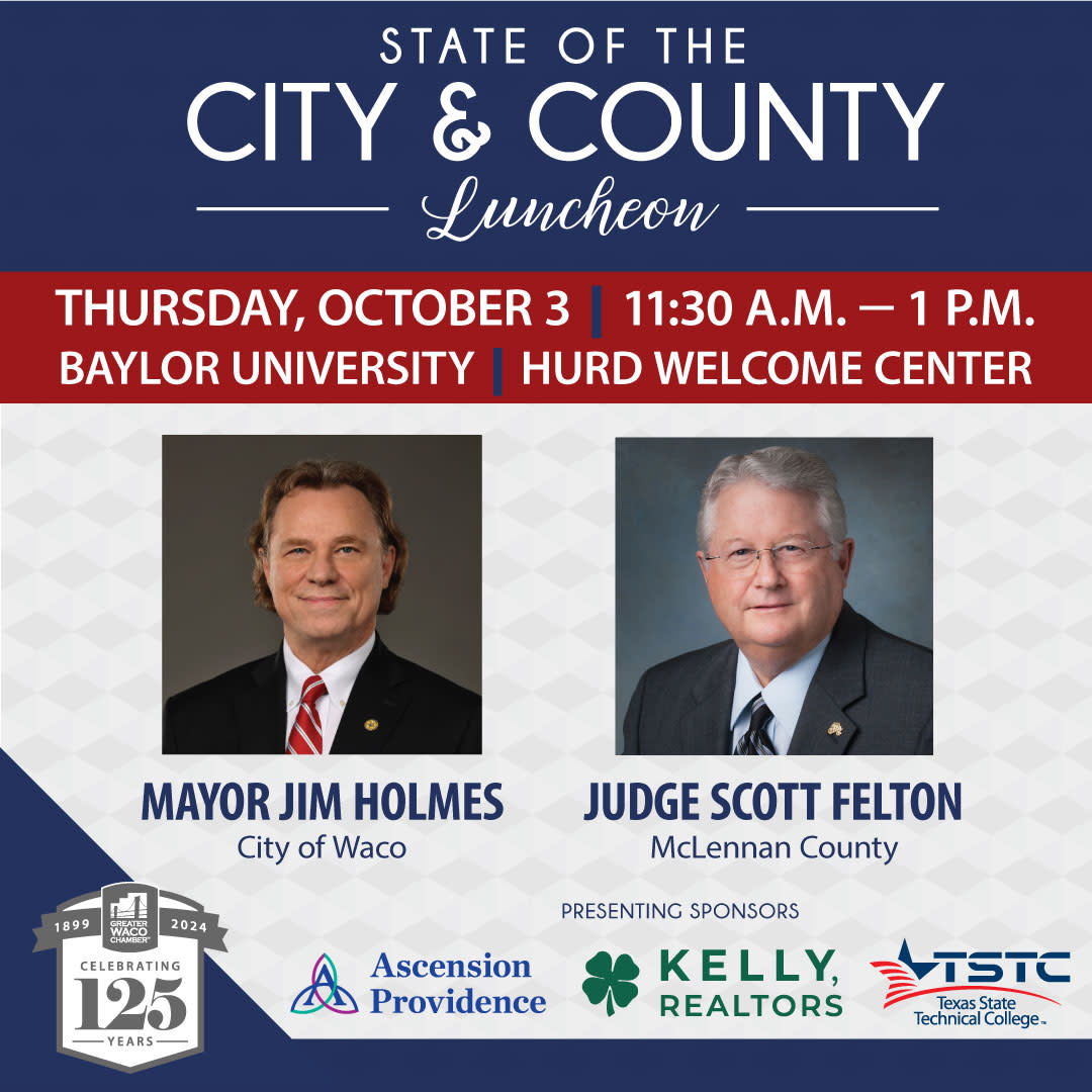 Please join us for our annual State of the City and County Luncheon on Thursday, October 3rd at 11:30 a.m. at The Hurd Welcome Center. We will hear an update and a look ahead from City of Waco Mayor Jim Holmes and McLennan County Judge Scott Felton. Register by Thursday, September 26th for this not-to-miss annual event!
