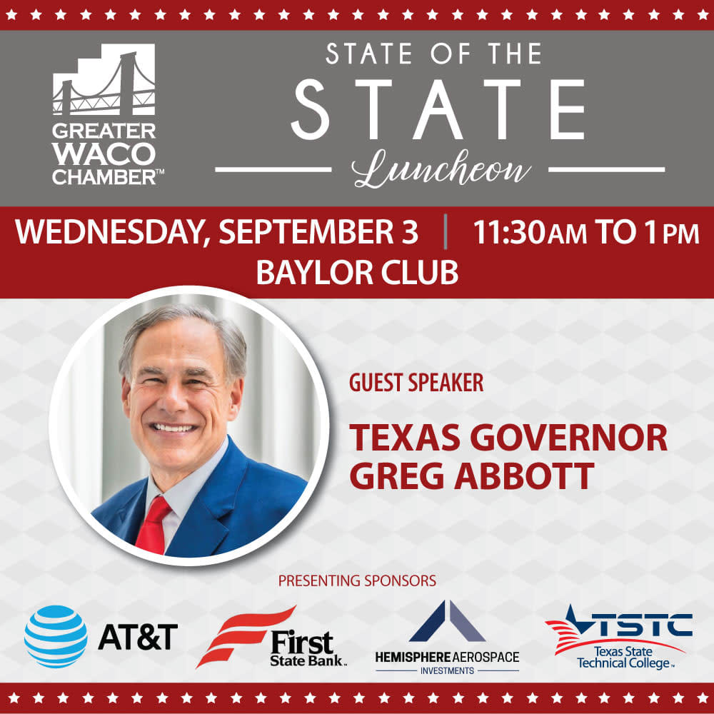 Please join us for our 2025 State of the State Luncheon on Wednesday, September 3, at 11:30 a.m. at the Baylor Club. We will be joined Governor Greg Abbott providing an overview from the 89th Legislative Session followed by a panel discussion with State Senator Brian Birdwell (SD-22), State Rep. Pat Curry (HD-56) and State Rep. Angelia Orr (HD-13). Register by Wednesday, August 27, for this not-to-miss annual event! Registrations are required to attend.